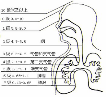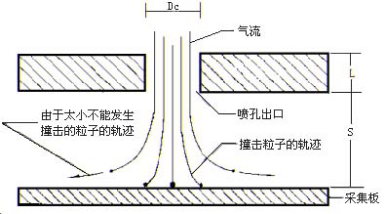 圖1給出不同空氣動力學(xué)等效直徑的粒子在人體呼吸系統(tǒng)中的沉降部位,采樣器的設(shè)計盡可能模擬這一特性。慣性撞擊原理早在五十年代就已經(jīng)提出來了。圖2給出一個噴孔附近粒子運動軌跡的示意圖。在一定的氣流速度時,一些慣性較大的粒子將撞擊到采集板上,而那些慣性較小的粒子則隨氣流繞行而進入下一級,在噴孔的幾何尺寸和氣流速度一定的條件下,不同空氣動力學(xué)等效直徑的粒子其撞擊概率是不同的,其特性可用撞擊效率曲線,一般常用撞擊效率為50%的直徑值作為這一級撞擊器的截斷直徑,并假設(shè)空氣動力學(xué)等效直徑大于截斷直徑的粒子將被100%地撞擊。